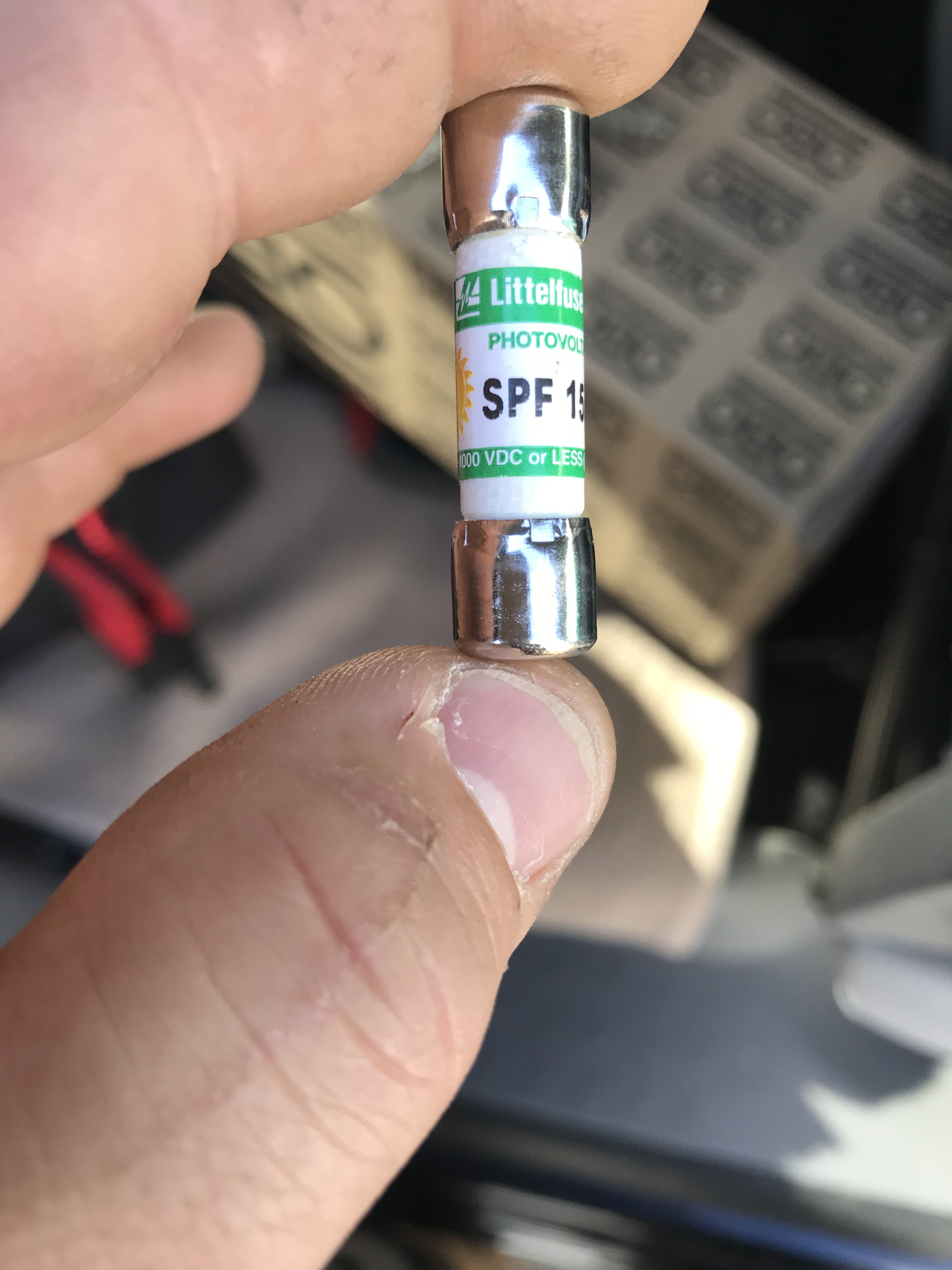 Nach Lokalisierung des Generatoranschlusskastens auf dem Dach wurde der Wechselrichter außer Betrieb genommen und der Kasten geöffnet sowie die Strangsicherung getrennt. Durch testen aller Sicherungen wurde ein Defekt festgestellt und ein Tausch vorgenommen. Danach lieferte der String wieder vollständig Energie.